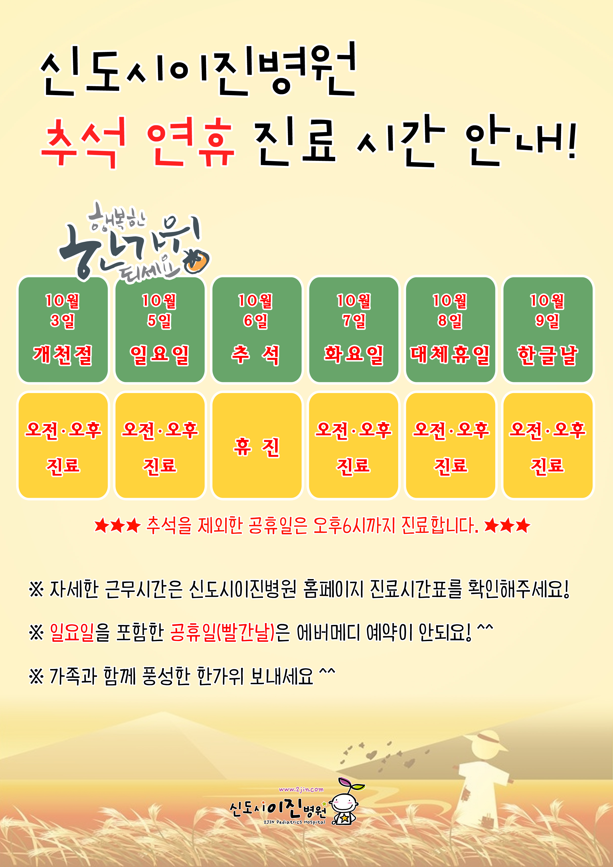 추석을 제외한 공휴일은 오후6시까지 진료합니다.