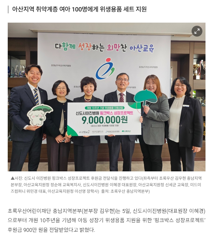 천안신문 https://www.icj.kr/bbs/board.php?bo_table=news&wr_id=53096 아산신문 http://assinmun.kr/news/view.php?no=14827 충청일보 https://www.ccdailynews.com/news/articleView.html?idxno=2377322 충청뉴스 https://www.ccnnews.co.kr/news/articleView.html?idxno=390614 바끄로뉴스 https://www.baccro.com/news/articleView.html?idxno=59263 한국투데이 https://www.hantoday.net/news/articleView.html?idxno=51245 충남일보 https://www.chungnamilbo.co.kr/news/articleView.html?idxno=857244 ... #신도시이진병원 #10주년 #핑크박스성장프로젝트#초록우산어린이재단 #아산교육청 #미즈메디컴퍼니 #나눔 #기부
